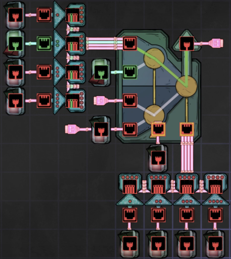 只要输入中含有绿色信号,信号选择器的贴图就会显示其传递的信号为绿色。只有当输入的全部位都为红色信号时,贴图才会显示传递信号为红色。请注意,与信号分配器不同,信号选择器的贴图行为和输出信号并不一定一致(如下图)。